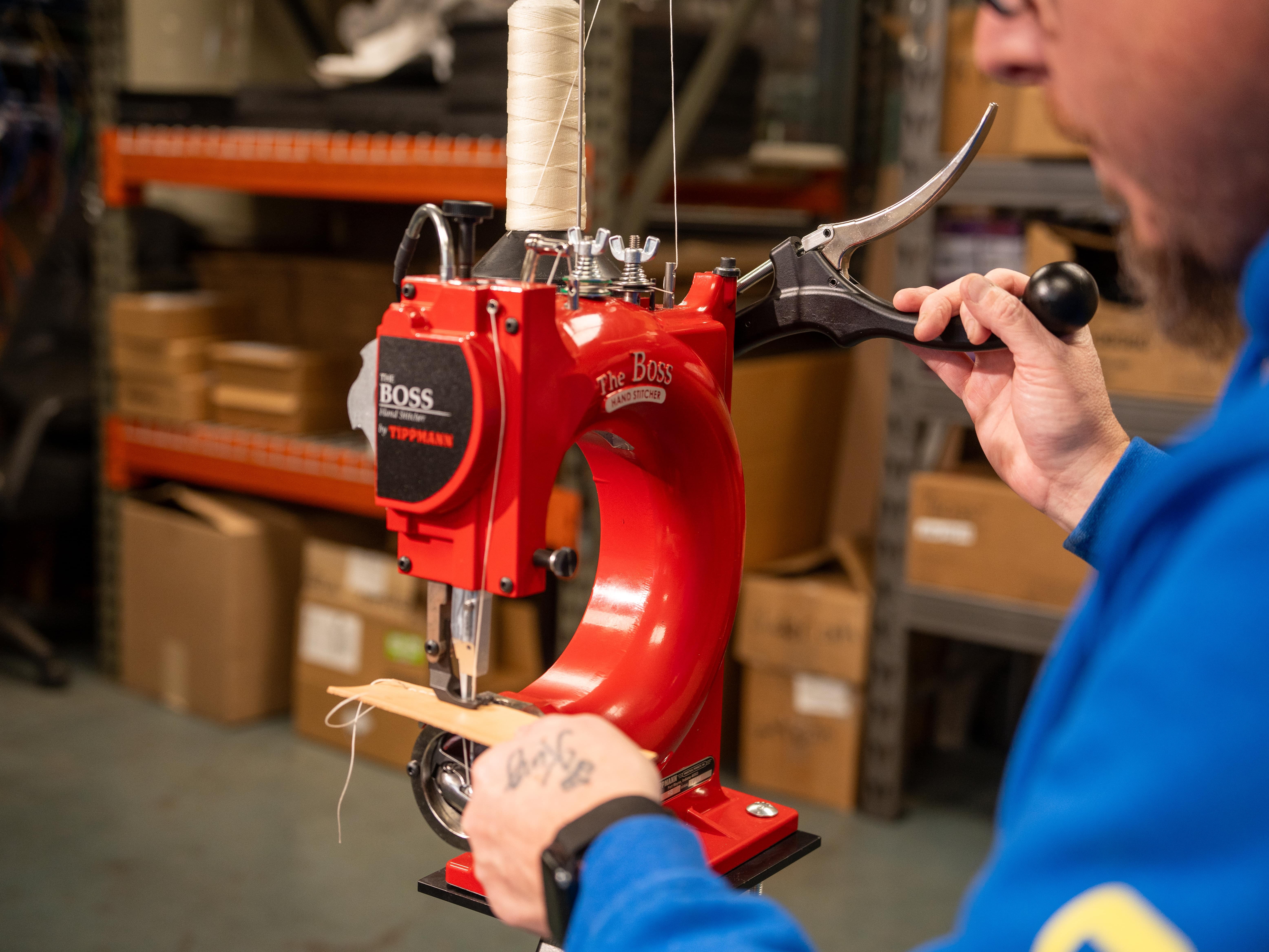 ā Heavy-duty manual sewing machine stitches through leather up to 3/4" thick, nylon, canvas, urethane, sheepskin, and other materials.